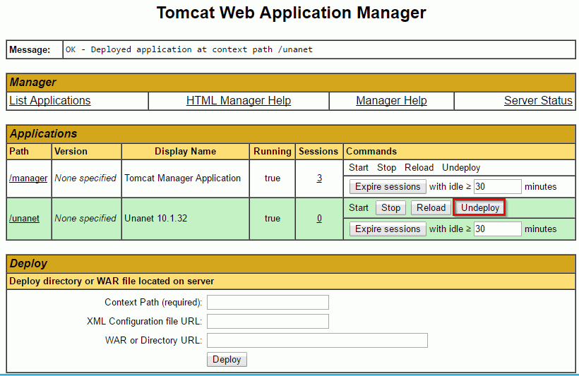 Once these items are removed, restart the Tomcat service, refresh Tomcat Manager in your browser to verify the Unanet application has fully undeployed (no longer exists as an application in the Tomcat Manager). Then, again follow the deployment directions entering the proper information in the 'Deploy directory or WAR file located on server' fields.